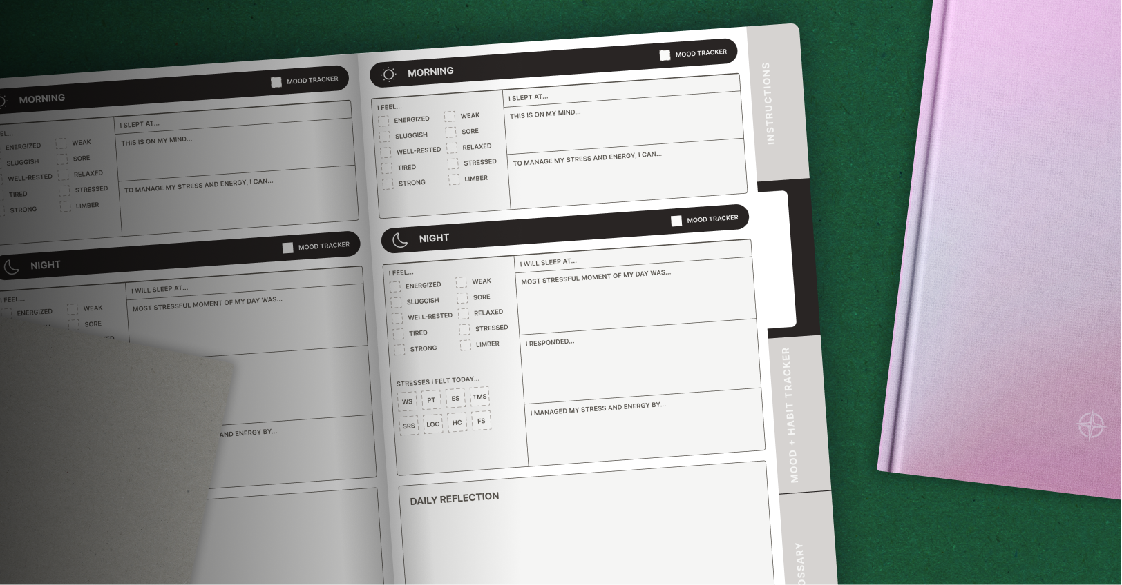 A quick, mindful pause to track your mood, energy, and stress—morning and night. Note what’s on your mind, identify triggers, and reflect on how you’re caring for yourself. Builds self-awareness and reveals patterns over time.